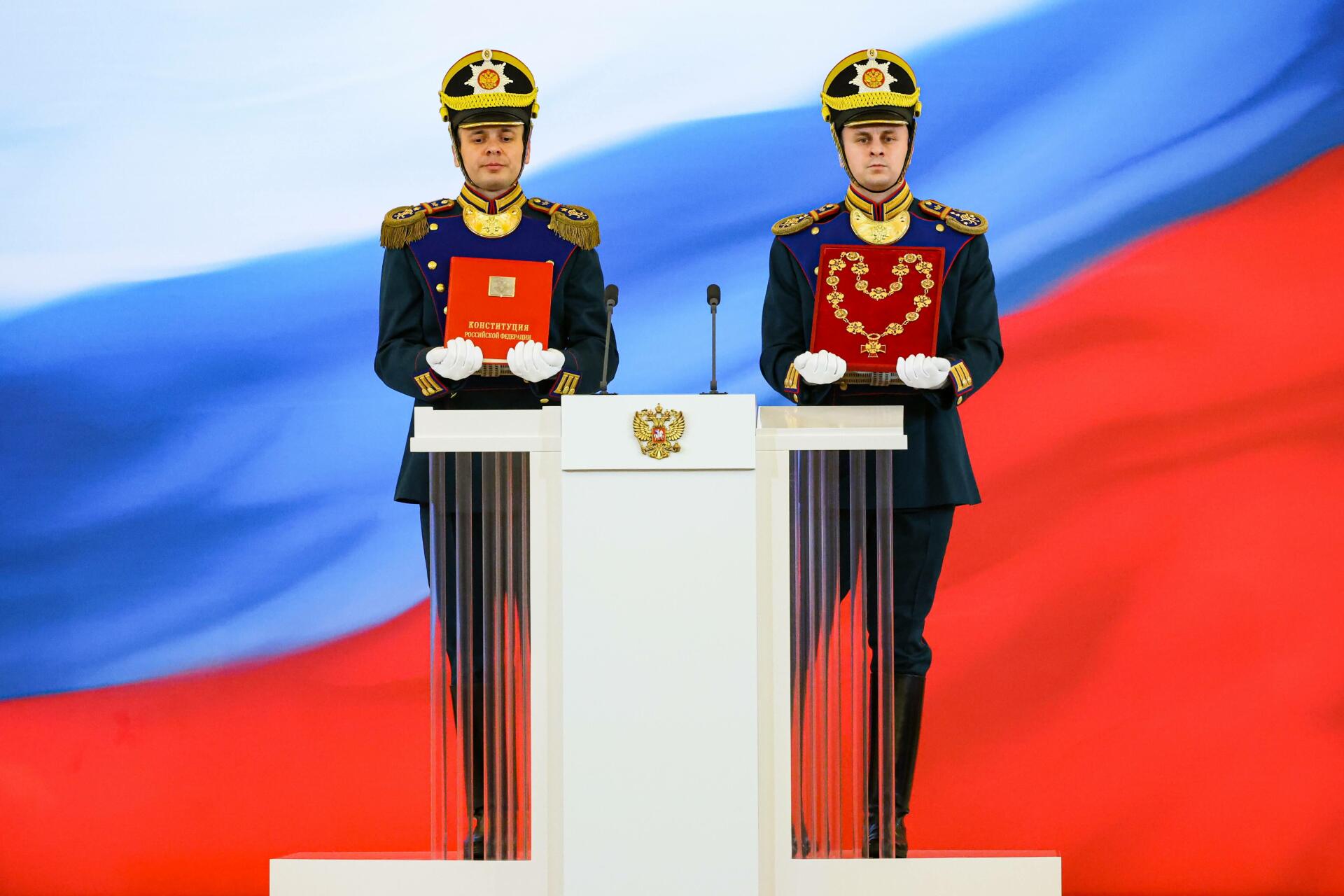 Фото: Ðîññèÿ. Ìîñêâà. Ñîëäàòû Ïðåçèäåíòñêîãî ïîëêà âûíîñÿò ñïåöèàëüíûé ýêçåìïëÿð Êîíñòèòóöèè è çíàê ïðåçèäåíòà íà öåðåìîíèè èíàóãóðàöèè â Áîëüøîì Êðåìëåâñêîì äâîðöå. Àëåêñàíäð Êàçàêîâ/ïðåññ-ñëóæáà ïðåçèäåíòà ÐÔ/ÒÀÑÑ